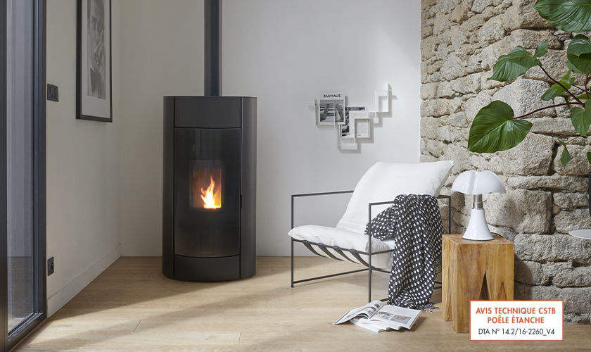 Lisa est un poêle à granulés étanche conçu pour répondre aux exigences des maisons neuves basse consommation (RE 2020). Il est raccordable à l'air extérieur et n'influe pas ainsi sur la pression de la maison.